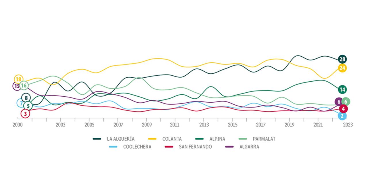 Aunque Alquería pierde dos puntos este año frente a 2022, vuelve a registrar el mayor top of mind en esta categoría: 28 por ciento. Esta caída la aprovecha Colanta, que ganó 5 puntos porcentuales y se mantiene en el segundo lugar, con 24 por ciento, y recorta la distancia de 11 a 4 puntos. Alpina, en tercer lugar con 14 por ciento de recordación, registra una caída de 4 puntos. Algarra gana 3 puntos y Parmalat no se mueve. Son los bogotanos, con 37 por ciento, los que más recuerdan a Alquería y Colanta registra mayor top of mind en Medellín, con 54 por ciento. El 29 por ciento de las mujeres recuerdan a Alquería y el 26 por ciento, a Colanta. Alquería tiene en los estratos 4, 5 y 6 su mayor recordación, con 35 por ciento, mientras que Colanta la tiene en el estrato 2, con 28 por ciento. La marca más innovadora entre las leches líquidas es Alquería, con 37 por ciento, 5 puntos más que en 2022; seguida por Alpina, con 25 por ciento, y luego se ubica Colanta, con 12 por ciento. La leche en la que más confían los colombianos es Alquería, con 39 por ciento, luego está Alpina, con 20 por ciento, aunque perdió 8 puntos. La que más creció en este indicador fue Parmalat, al pasar de 4 a 10 por ciento.