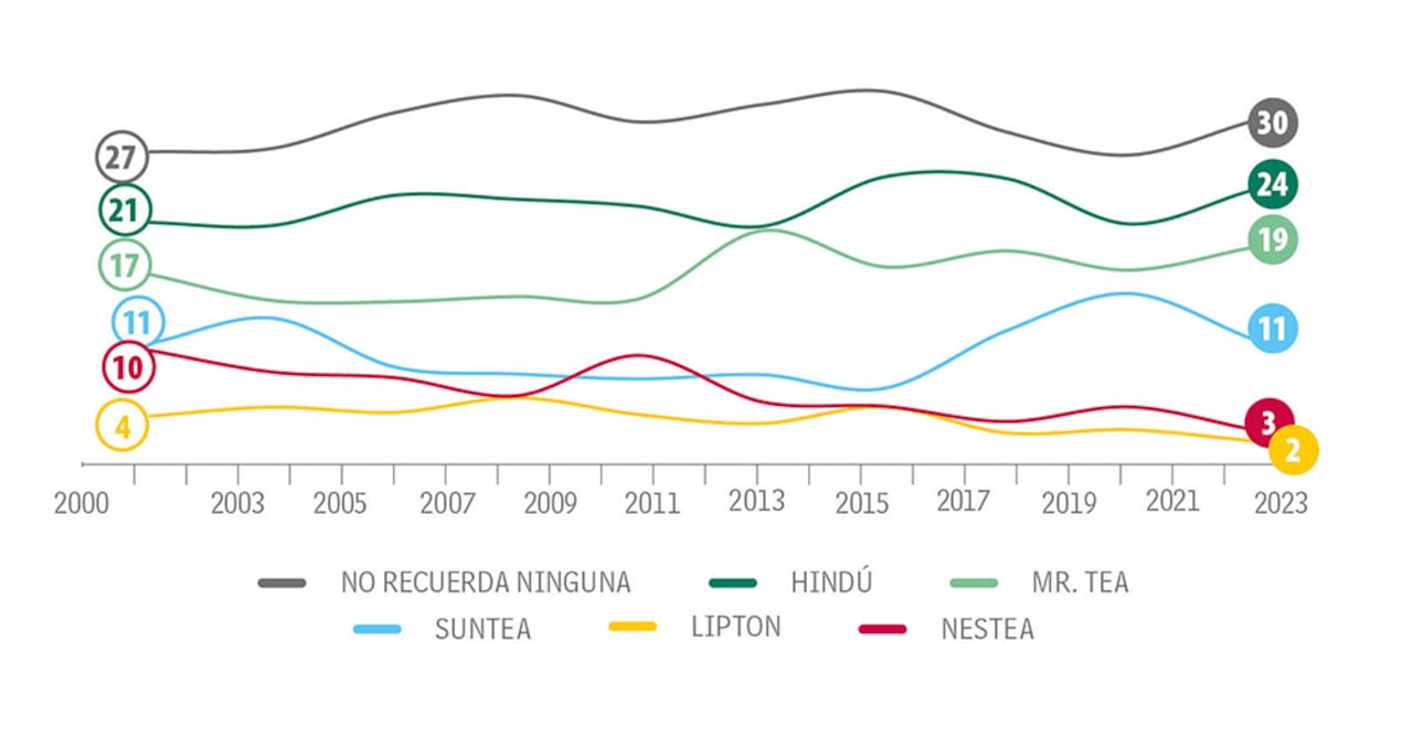 El ‘no recuerda’ volvió a ganar terreno en esta categoría en la mente de los adultos colombianos, con 30 por ciento, 3 puntos más que en 2022. Sin embargo, las marcas no se entregan y las líderes siguen creciendo en recordación. Encabeza este segmento Hindú, con 24 por ciento, 3 puntos adicionales al registro del año pasado, seguido por Mr. Tea, con 19 por ciento, 2 puntos adicionales al año pasado. Suntea obtuvo 11 por ciento, 4 puntos menos que en 2022. En Bogotá y Medellín, una de cada tres personas encuestadas ‘no recuerda’ ninguna marca de esta categoría. Es en Cali donde más recuerdan a Hindú, con 32 por ciento, seguida de Bogotá, con 25 por ciento. Mr. Tea, con 39 por ciento, es la más presente en la mente de los barranquilleros, mientras que en Cali Suntea alcanza el 15 por ciento. En esta categoría, la marca más innovadora es Hindú, con 28 por ciento. Mr. Tea, con 8 puntos más frente al año pasado, alcanza 23 por ciento. En cuanto a confianza, también Hindú vence, con 30 por ciento, seguido de Mr. Tea, con 19 por ciento.
