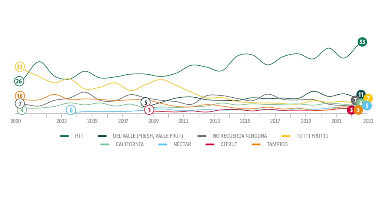 Con 11 puntos más que en 2022 y 53 por ciento este año, Hit registra su mayor top of mind en la categoría y le saca 42 puntos porcentuales al segundo, Del Valle, que tiene 11 por ciento, cuatro puntos menos que el año pasado. El ‘no recuerda’ registra 7 por ciento, al igual que Tutti Fruti. En Barranquilla el 61 por ciento de los adultos tienen en su mente a Hit, mientras Del Valle es más recordado en Medellín, con 15 por ciento. En la capital antioqueña se registró la mayor caída para Hit, en donde perdió 13 puntos en el nivel de recordación. Los hombres recuerdan más a Hit, con 57 por ciento, mientras que Del Valle registra 11 por ciento de recordación entre las mujeres. La marca líder es más recordada en el estrato 3, con 55 por ciento, mientras que el top of mind más alto de Del Valle está en el estrato 2, con 15 por ciento. Hit, en los adultos entre 25 y 34 años alcanza 70 por ciento, mientras que Del Valle tiene un nivel de recordación de 12 por ciento entre los de 18 y 24 años. La marca más innovadora de jugos en 2023 es Hit con 46 por ciento, 4 puntos más que en 2022, seguida por Del Valle, con 9 por ciento. La marca de esta categoría en la que más confían los adultos en Colombia es Hit, con 44 por ciento, 5 puntos más que el año pasado.