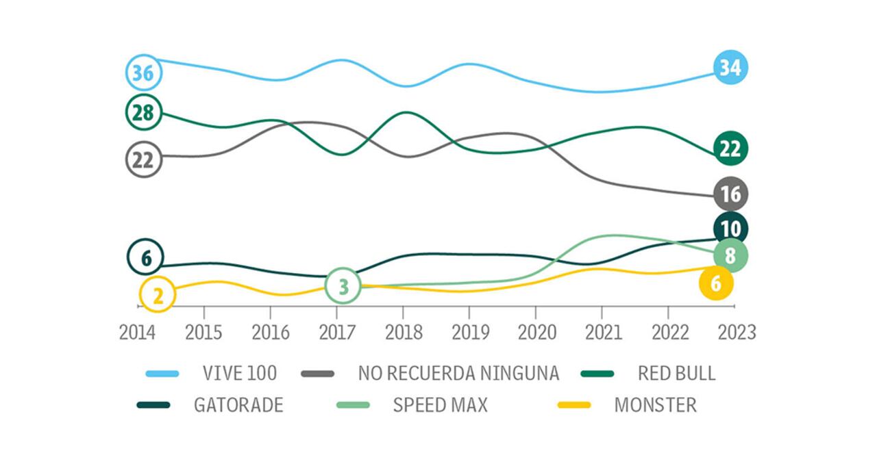 El top of mind en esta categoría lo tiene Vive 100 con 34 por ciento, 2 puntos porcentuales más que en 2022. Le sigue Red Bull, con 22 por ciento, aunque con 4 puntos menos frente al año pasado. El ‘no recuerda’ sigue perdiendo espacio en la mente de los adultos consultados, dejando memoria para otras marcas líderes, como Gatorade (10 por ciento) y Speed Max (8 por ciento). Son los barranquilleros los que más impulsan el primer lugar de Vive 100, con 38 por ciento de recordación, mientras Red Bull es más recordado en Bogotá, con 24 por ciento. Mujeres y hombres en igual porcentaje (34 por ciento) recuerdan a la marca líder, mientras que a Red Bull lo tienen más presente en su mente los hombres, con 27 por ciento. El 40 por ciento de los adultos de estrato 2 recordaron más a Vive 100 y es en los estratos 4, 5 y 6 en donde Red Bull registra su mayor top of mind con 27 por ciento por estratos. En temas de innovación se cambian los puestos alcanzados en el top of mind: Red Bull se constituye como el líder, con 34 por ciento, 4 puntos menos que el año pasado, y en segundo lugar Vive 100, con 25 por ciento, igual porcentaje que en 2022. Gatorade da el mayor salto dentro de la percepción de las marcas más innovadoras, al pasar de 5 a 11 por ciento entre 2022 y 2023. La marca de energizantes en la que más confían es Vive 100, con 22 por ciento, seguida por Red Bull, con 17 por ciento, y Gatorade con 14 por ciento.