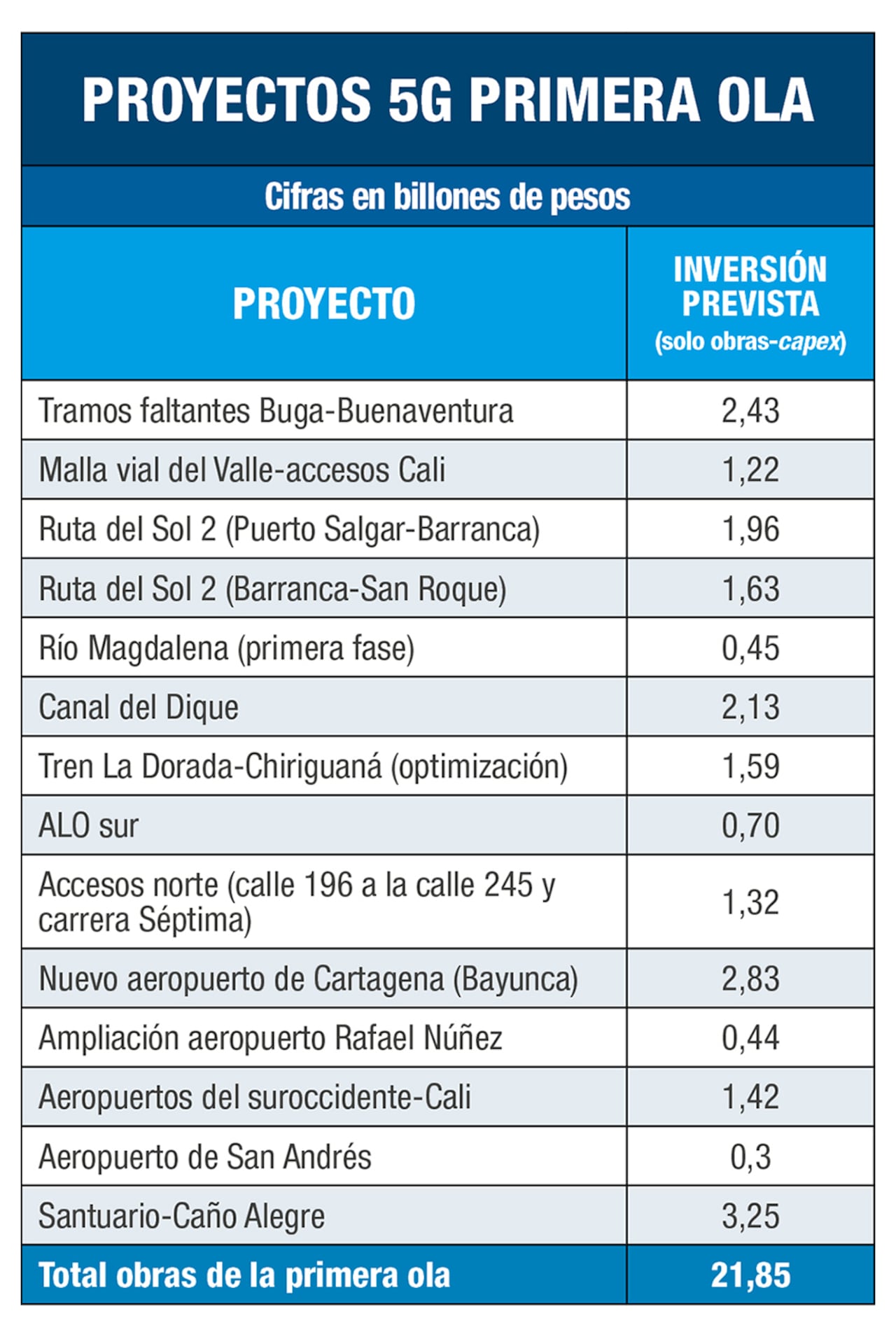 Sin embargo, buena parte de las ofertas se abrirán entre 2022 y 2023. En contraste, casi todos los 15 proyectos de la primera ola de 5G de Colombia se contratarán este año, por un monto de 22 billones de pesos, es decir, cerca de 6.285 millones de dólares.Además, la 5G prevé la construcción de aeropuertos, una vía férrea, el canal del Dique y las mejoras para la navegabilidad del río Magdalena.