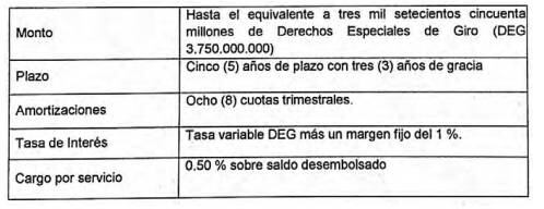 Las amortizaciones se harán en ocho cuotas trimestrales y la tasa de interés tendrá la variable de derechos especiales de giro (DEG) más un margen fijo del 1 %.