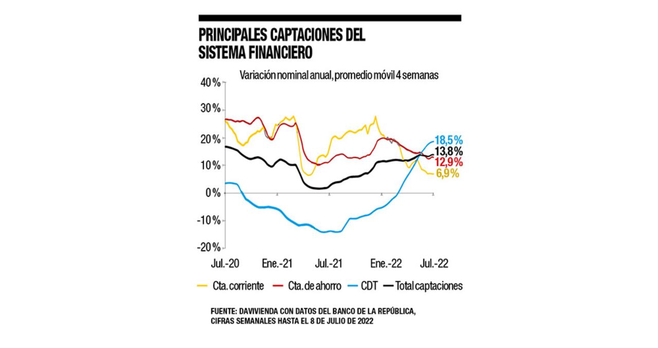 Así como las tasas de interés buscan desincentivar el crédito, también son un aliciente para ahorrar. Si bien Colombia no se ha destacado por su grado de ahorro, ya se ven señales de mejoras en este frente. Hasta el 8 de julio los establecimientos de crédito tenían depósitos por 561,6 billones de pesos, los cuales estuvieron impulsados especialmente por los certificados de depósito a término (CDT), que crecen al 18,5 por ciento, el ritmo más alto desde abril de 2017. De hecho, para el 25 de julio, la tasa de interés de los CDT a un año alcanzó el valor más alto desde que se tiene registro (12 por ciento).