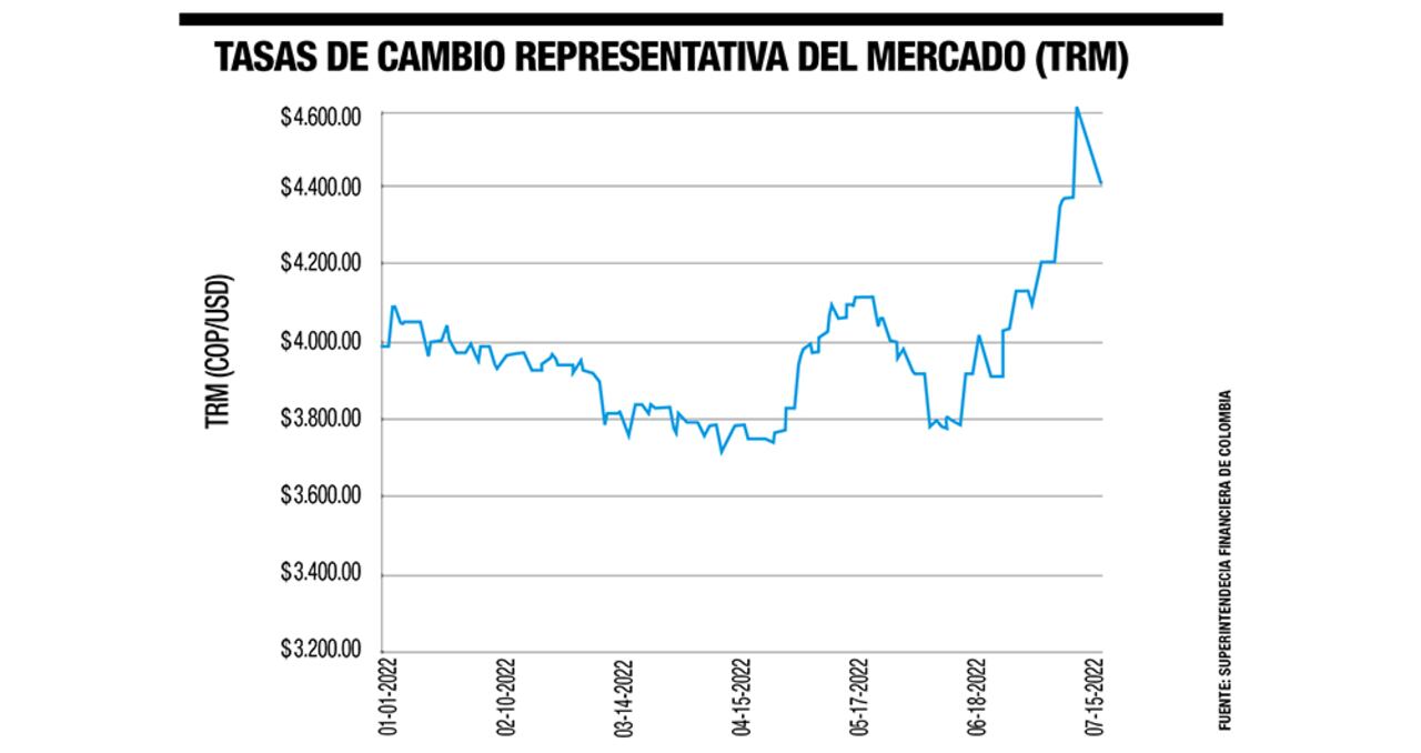 Hace apenas un mes y medio, a principios de junio, el precio de la divisa estaba en un poco más de 3.700 pesos. Fue el piso que tocó luego de alcanzar a mediados de mayo una cifra superior a los 4.110 pesos. Sin embargo, lo que se ha vivido en los últimos días ha sido la espiral alcista más intensa en la historia reciente de esa moneda. Desde el 17 de junio, cuando llegó a los 3.912 pesos, no ha parado de subir. Solo en las más recientes jornadas dio una tregua y frenó su ímpetu. Pero la fuerza de su incremento ha llevado a que, al inicio de la semana, día tras día, el dólar rompiera sus máximos históricos hasta llegar a 4.627 pesos, lejos de los 4.200 que alcanzó en lo más profundo de la crisis de la pandemia. Es decir, en apenas 45 días el valor del dólar aumentó más de 850 pesos en su punto más alto, pero al cierre de la semana cayó 231 pesos.