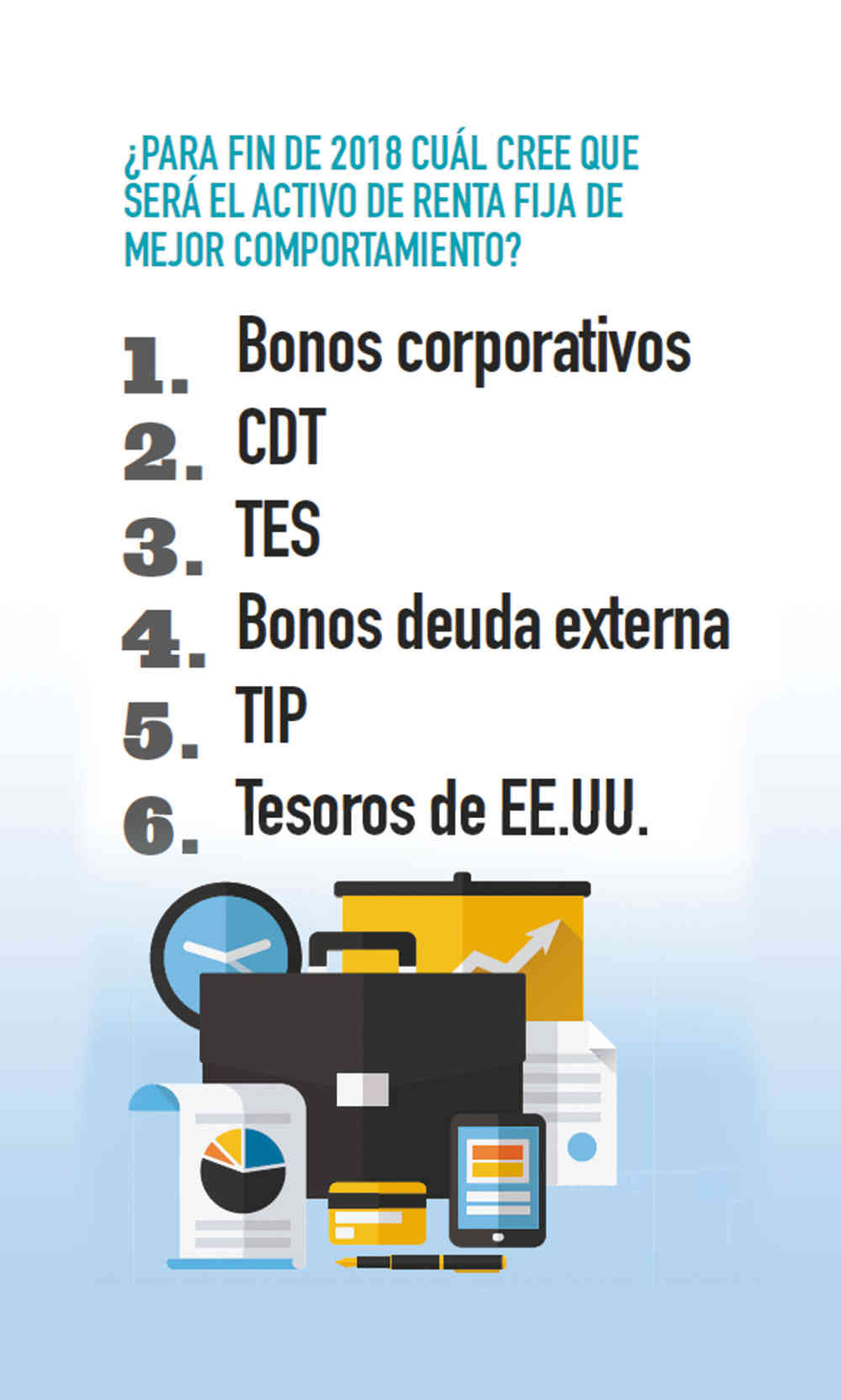 *Las recomendaciones de inversión, proyecciones y probabilidades presentadas en este informe se basan en una encuesta realizada por Dinero entre el 19 de diciembre de 2017 y el 10 de enero de 2018. Fue respondida por Fénix Valor, Acciones y Valores, Credicorp, Banco de Bogotá, Bbva, Casa de Bolsa, Ultraserfinco, Asobancaria, Old Mutual, BTG Pactual, Colfondos, Fidubogota, Global Securities, Alianza, Valora Inversiones, Protección, Bancolombia, Itaú y el experto en acciones Andrés Moreno.
