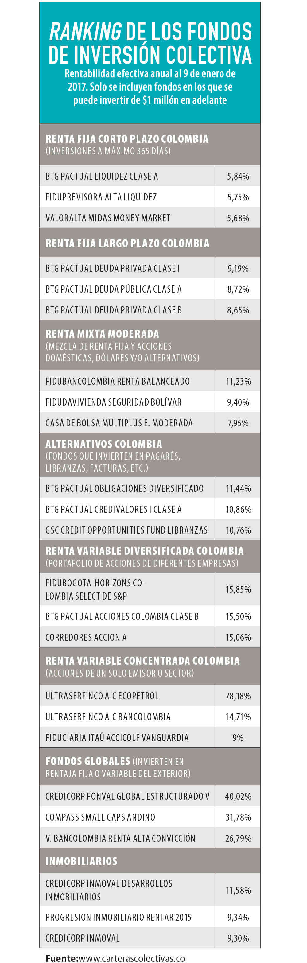 Actualmente operan 350 FIC, con más de US$21.000 millones bajo gerencia. Dado que la oferta es amplia, se usa la información del portal www.carterascolectivas.co, especializado en la materia, para determinar cuáles son los fondos con mejor desempeño en el último año. No obstante, vale la pena recordarles a los inversionistas que rentabilidad pasada no es garantía de rentabilidad futura.