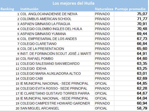 Cinco instituciones puntean la lista de los mejores colegios del Huila en 2018. Se trata del Colegio Anglocanadiense de Neiva, el Colombus American School, el Aspaen Gimnasio La Fragua, Colegio Colombo Inglés del Huila y Aspaen Gimnasio Yumana. Estos colegios, todos privados, tienen puntajes promedio de 75,07; 71,77; 70,91; 70,48 y 69,44, respectivamente. Dentro del listado de los 20 primeros colegios de esa región del país sobresalen cuatro colegios oficiales.