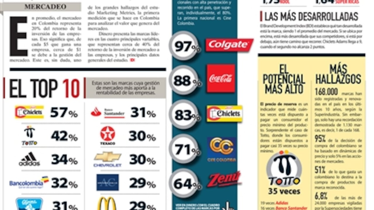 En promedio, el mercadeo en Colombia representa 20% del retorno de la inversión de las empresas. Eso significa que, de cada $5 que gana una empresa, cerca de $1 se debe a la gestión del mercadeo. Este es, sin duda, uno de los grandes hallazgos del estudio Marketing Metrics, la primera medición que se hace en Colombia para analizar el valor que genera del mercadeo.?Dinero presenta las marcas líderes en las cuatro principales variables, que representan cerca de 40% del retorno de la inversión de mercadeo a las empresas, y los principales datos generales del estudio.