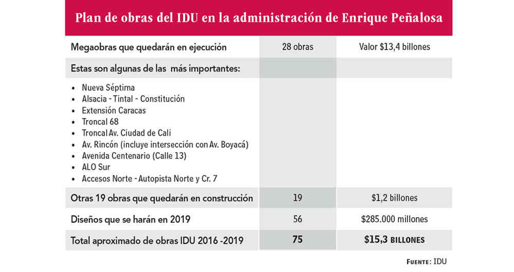 En cuanto a los tramos no contratados en la Autopista Norte (accesos), se contempla adjudicarlos en las próximas semanas e iniciar obra en junio próximo. El IDU también habla de otras 19 obras que alcanzará a dejar en construcción este año. Se destacan las extensiones de la Avenida de las Américas, que se adjudicará en mayo próximo, y de la Avenida Boyacá de la 170 a la 183 y cuya obra inicia en los próximos días.