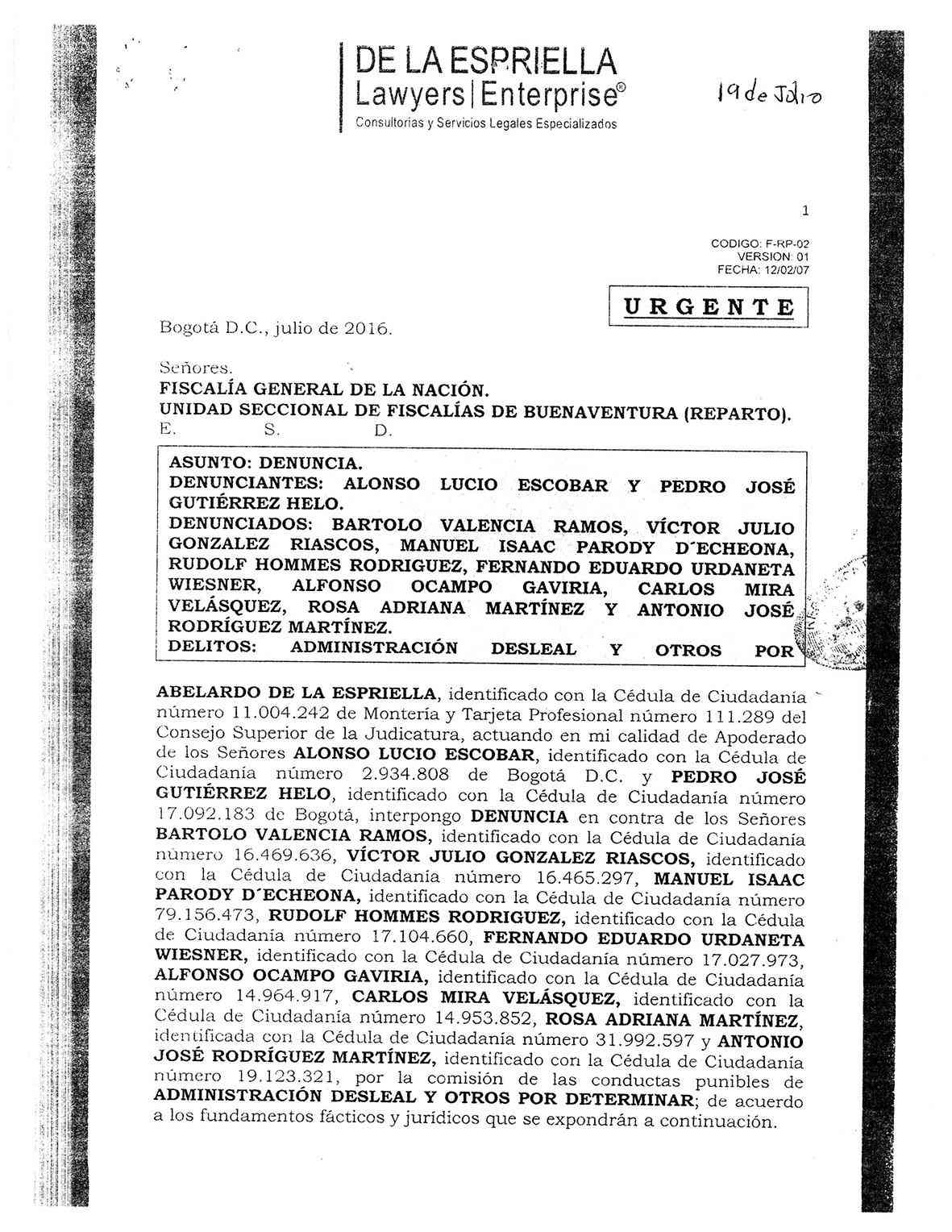 Los reclamantes también explicaron que en 2015 la junta directiva de la Sociedad Portuaria decidió comprar las participaciones accionarias de las 4 grandes operadoras, dejando por fuera y desconociendo el acuerdo inicial para incluir a los pequeños. Luego, el 19 de abril de 2016, se fusionó Tecsa con la Sociedad Portuaria, una decisión que fue interpretada por los pequeños operadores como la estocada final. La documentación presentada por los operadores excluidos es tan extensa que da para varios libros. En esos documentos se da cuenta –según ellos– de manipulación de actas de juntas, conflicto de intereses y administración desleal, entre otras irregularidades. El capitán Pedro José Gutiérrez, contrató al abogado Abelardo de la Espriella para denunciar ante la Fiscalía tales hechos.