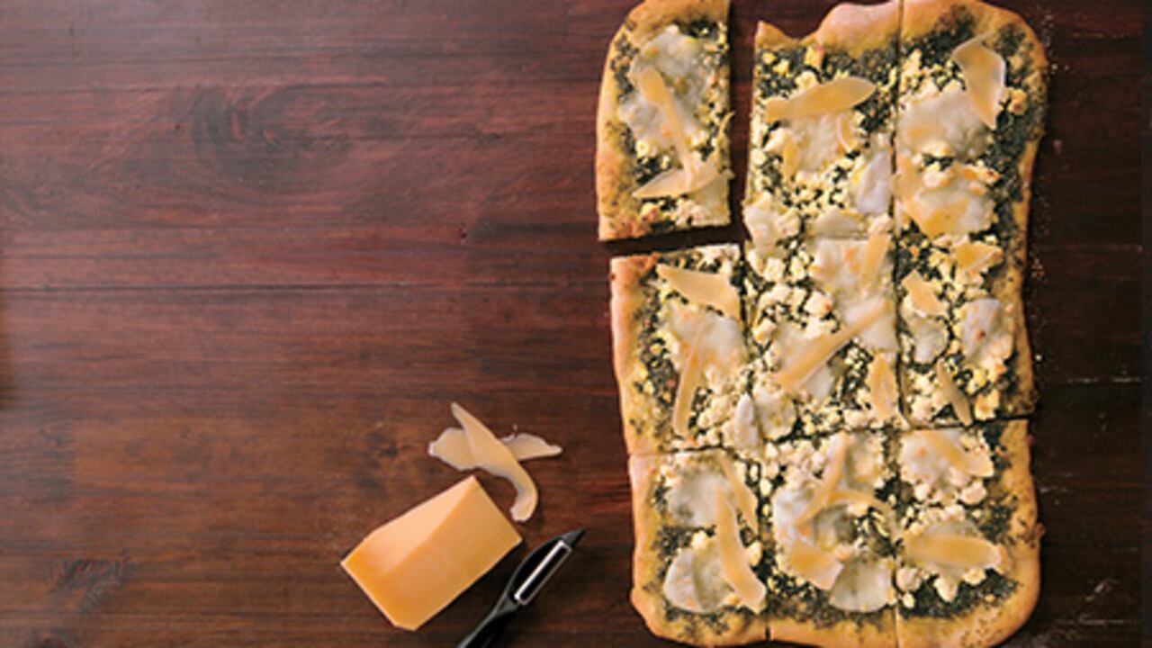 Precaliente el horno a 230 °C. Extienda la masa en forma rectangular y ponga en una lata para horno espolvoreada con harina de maíz. Extienda el pesto sin llegar el borde. Esparza el queso ricotta y disponga los bocconcini. Hornee por 15 minutos o hasta que esté dorado el borde. Con un pelador de vegetales, saque lajas de queso parmesano y póngalas sobre de la pizza. Termine con pimienta negra por encima.