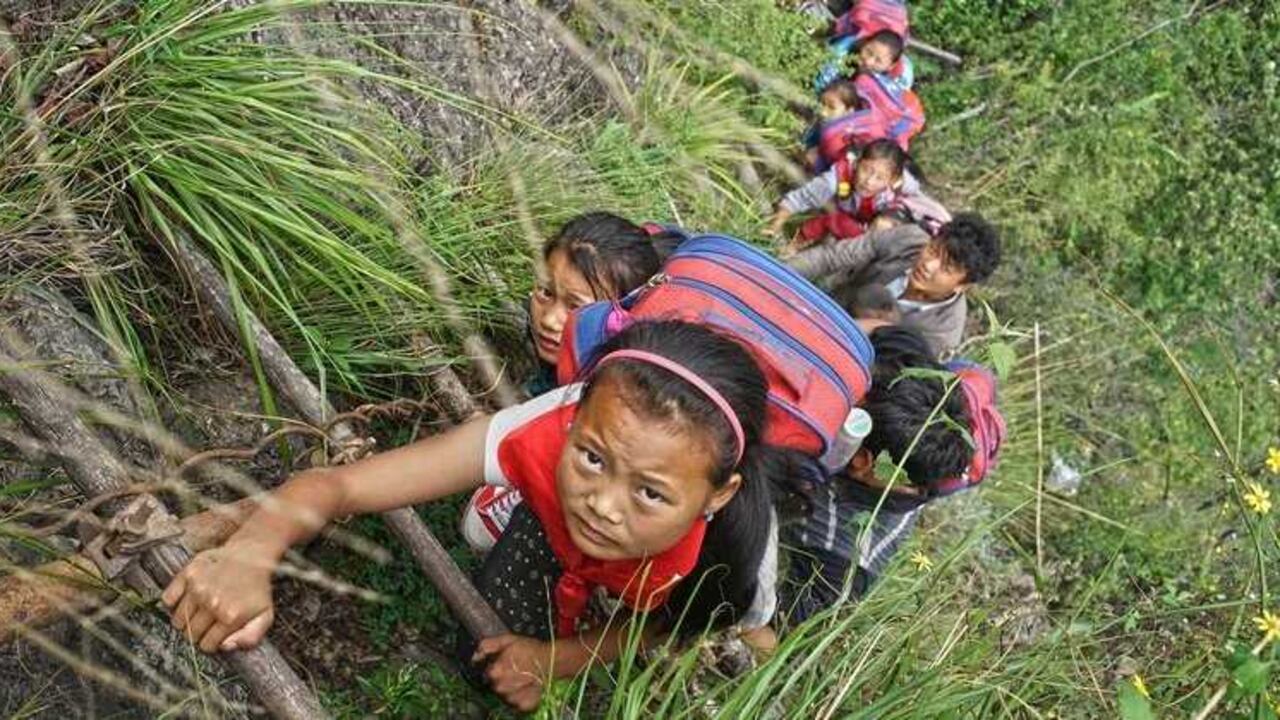 Para asistir a clases, los alumnos del pueblo de Atuler, ubicado en la provincia de Sichuan, deben subir por una pared de roca de 800 metros de altura, trepando por unas escaleras desvencijadas y arañando las rocas a medida que avanzan. El hecho fue reportado por un diario local y a raíz de esto, las autoridades del suroeste de China se comprometieron en resolver este hecho aislado.