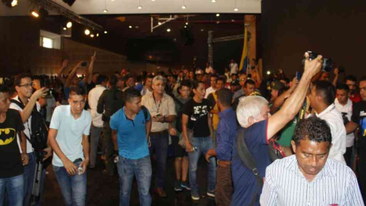 E.S.: Cuando salimos de la plazoleta hacia el centro de convenciones, los policías nos impidieron la entrada. "No pueden pasar", nos dijeron. Eso nos disgustó. Les dijimos: "Vamos a pasar", y nos volamos unas barandas y pasamos el primer filtro policial. Cuando llegamos a la entrada del lobby, nos volvieron a cerrar la puerta. Ahí comienza la agitación, sale un funcionario de la Policía y concilia con nosotros, nos dice que está lleno el recinto, pero era mentira todavía estaban ingresando por las puertas laterales. Después nos dijo, "no caben todos", nosotros le dijimos que íbamos a entrar todos.