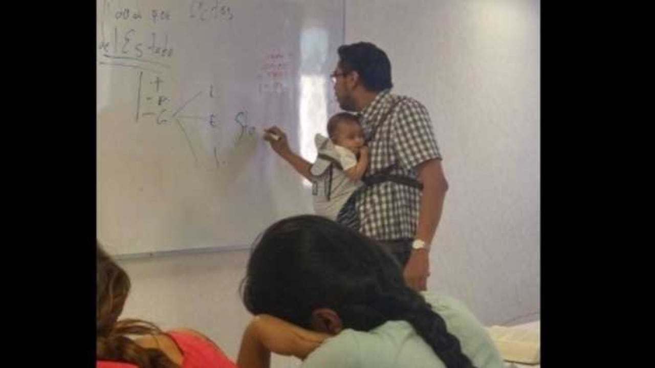 Moisés Reyes es un profesor de Derecho de la Universidad Interamericana de Desarrollo en Acapulco, México, que publicó en su página de Facebook una imagen en la que sostiene a un bebé mientras dicta su asignatura. Junto a esta, el siguiente mensaje: “Tengo una alumna, que no ha desertado a la escuela a pesar de sus distintos roles, por eso decidí cargar a su hijo, sin interrumpir la clase para que tomara apuntes. #Acapulco”.