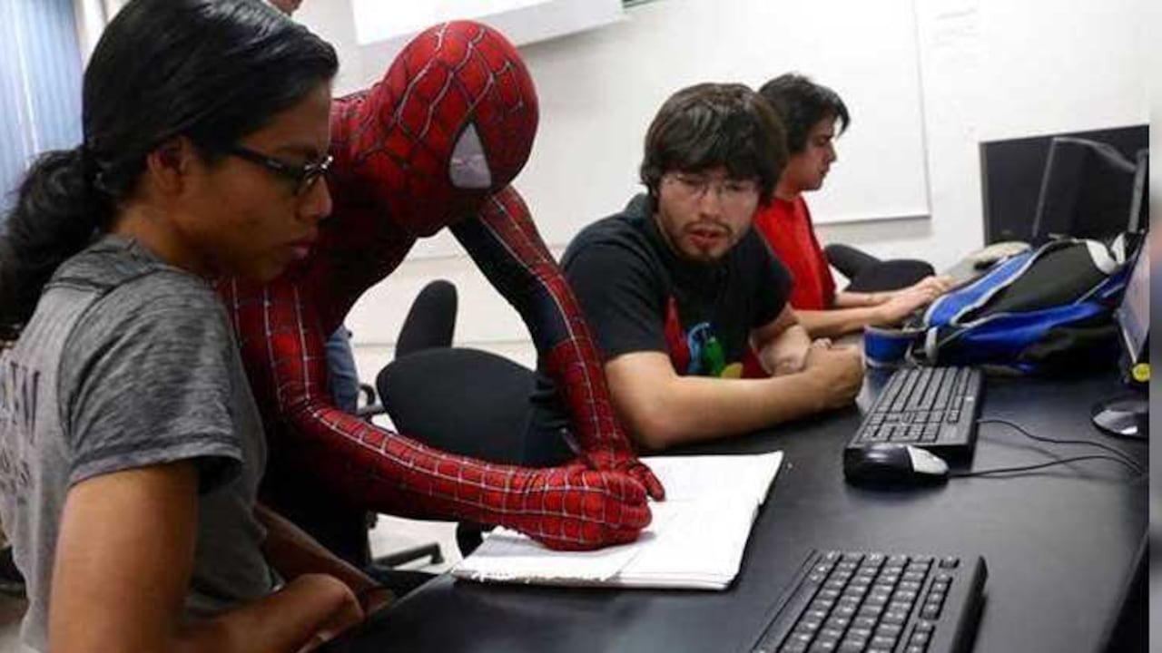 La historia de Vázquez y su gusto por el superhéroe comenzó en el 2002, cuando empezaron a llegar a los cines las películas protagonizadas por TobeyMaguire. Vázquez quería un disfraz de Spiderman y al no encontrar uno que le gustara decidió hacérselo él mismo. “Lo terminé en el 2014. Un día me topé con un cómic de AmazingSpiderman en donde aparece dando clases y dije: ‘No es una mala idea que Spiderman dé clases de ciencias de la computación’, y así nació SpiderMoy”, dice el joven en una entrevista a un medio local, que con su disfraz atrae a los alumnos y además maneja los temas que enseña a la perfección.