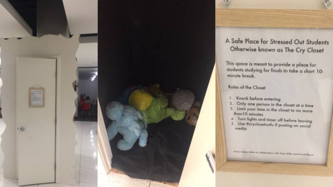 El cubículo de madera que hizo Miller en un taller de carpintería tiene el interior totalmente forrado de negro y está lleno de animales de peluche. En la puerta cuelga un letrero en el que se puede leer, “es un lugar seguro para el estudiante estresado, también conocido como el armario del llanto. Este espacio está destinado para que aquellos que estudian en finales tomen un breve descanso de diez minutos”.