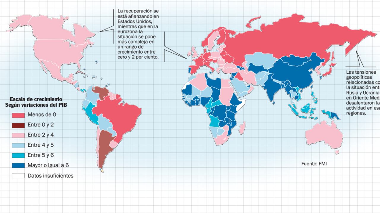 La mejoría sería mucho más dispar en economías emergentes. China tendría un crecimiento cercano a 7,2 por ciento e India repuntaría a 6,3 por ciento pero Rusia y Brasil, con sus problemas cambiarios y de inflación que permanecerán en 2015, continuarían en recesión y estancamiento respectivamente. América Latina apenas crecerá un 2 por ciento.