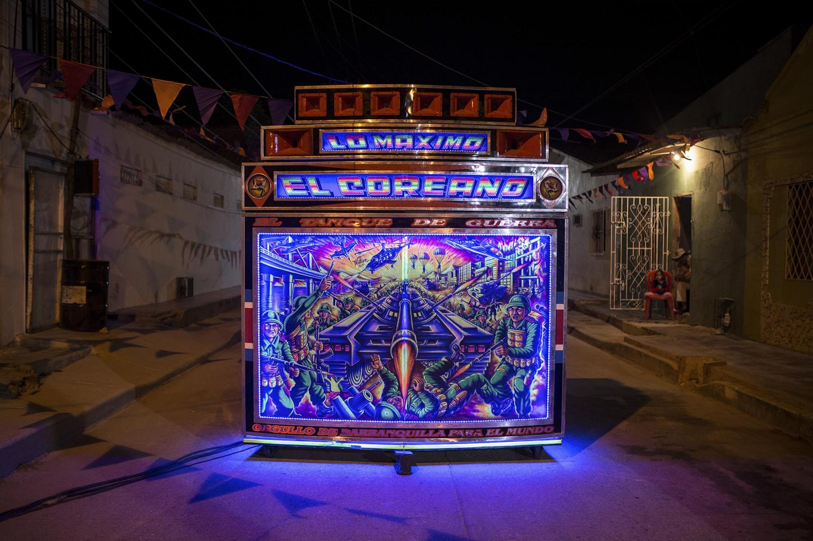 A mediados de los años 60, Alfonzo Navarro, primo del legendario picotero Concepción Hernández, regresó de luchar en la guerra de Corea, estaba herido en una pierna que después le amputaron. Los amigos llamaron a Alfonso EL COREANO, y junto a Concepción bautizaron así a la gigantesca maquina con la que hacían fiestas por todo el sur de Barranquilla. Ese vibrante cajón lo perpetúa la pintura que recuerda a películas como Apocalipsis now o Full metal Jacket. El artista es William Gutiérrez, quien para esa época ya era toda una leyenda por sus pinturas realistas.