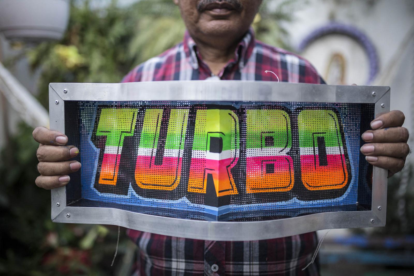 El vinilo lleno de colores fluorescentes se riega por las rendijas de los picós y va formando a El Coreano. También ha hecho al Solista, a El Gran Che’, ‘El Gran Pijuán’, ‘El Rojo’ y ‘El Melódico’. Su técnica viene de Alsanders, uno de los dos legendarios pintores picós, junto a Belimastth. Es William Gutiérrez, uno de los pintores más destacados de la actual escena picoteril, desde su taller-casa ubicado en El Barrio Santo Domingo.