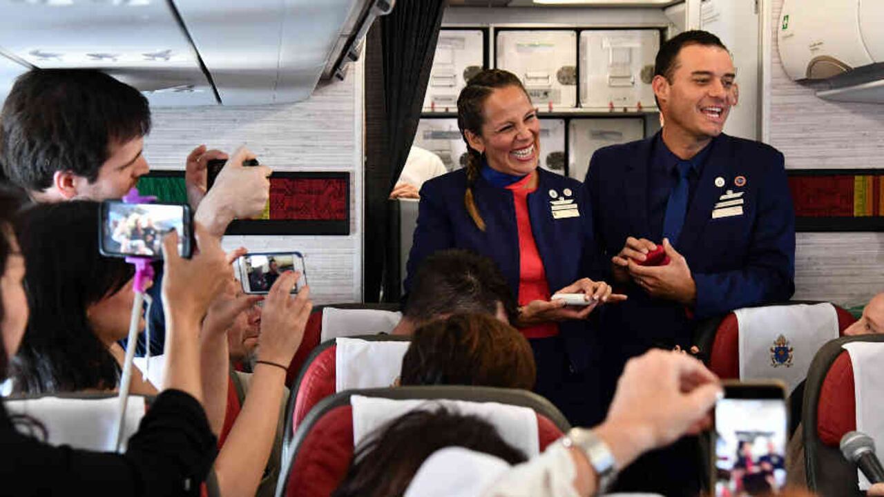 Podest, de 39 años, y Ciuffardi, de 41, azafata y azafato, dieron el "sí, quiero" a 11.000 metros de altura ante el pontífice después de que éste les preguntara si "estaban seguros", contó el esposo.