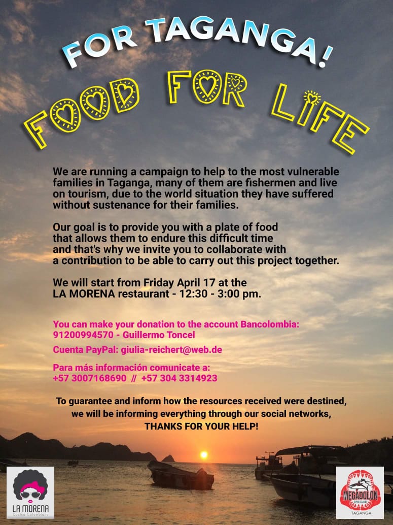 Uno de los afectados por la falta de turistas es Guillermo Cantillo, un nativo taganguero que conoce como pocos la fauna marina de este lugar. A pesar de los malos momentos que pasaba, Guillermo y su novia, Giulia Reichert, una alemana que quiere pasar el resto de su vida en Taganga, donaron varios mercados de $700.000 pesos a unas agencias que repartían comida.