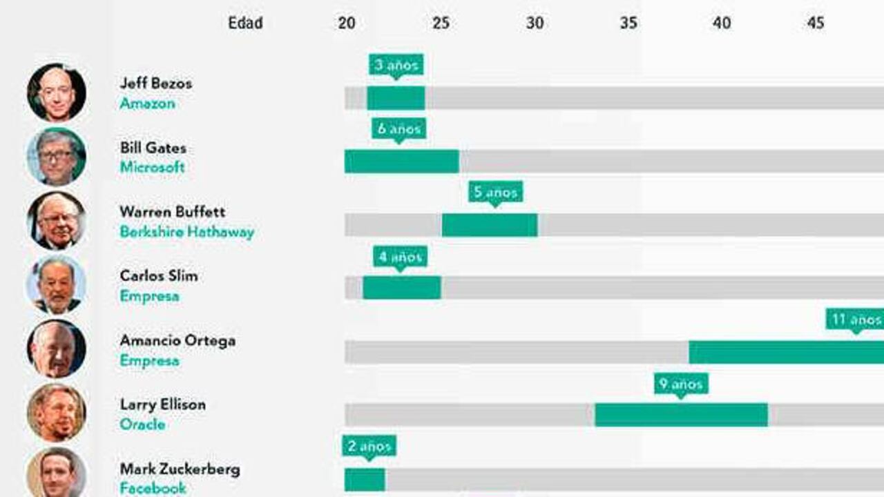 Ganar el primer millón de dólares es un momento crucial para todo magnate. Según un estudio de los 100 hombres más ricos del mundo, realizado por el portal Slotsia.com, en promedio necesitaron unos ocho años para llegar a esa marca y lo hicieron cuando tenían 36 años. De esta cuenta se excluyen, por supuesto, los que heredaron su fortuna.