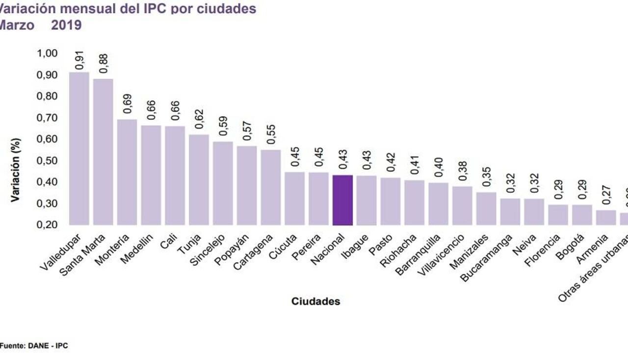 En marzo de 2019, la inflación fue de 0,43%, según acaba de informar el Departamento Administrativo Nacional de Estadística (Dane). De esta manera en los primeros tres meses se acumuló una variación de precios en la economía colombiana de 1,62% y para el año comprendido entre abril de 2018 y marzo de 2019 de 3,21%. Todos estos indicadores son superiores a los registrados el año pasado. Según distintos analistas como el departamento de investigaciones económicas de Bancolombia, uno de los factores que pudo haber impulsado el alza de los precios fue la minga indígena en el Cauca que significó problemas de abastecimiento y en consecuencia hizo que el valor de ciertos productos, sobre todo alimentos y combustibles subiera durante este tercer mes del año. Según el Dane, la mayor variación por sectores lo registraron los alimentos y bebidas no alcohólicas con un registro de 0,95%.