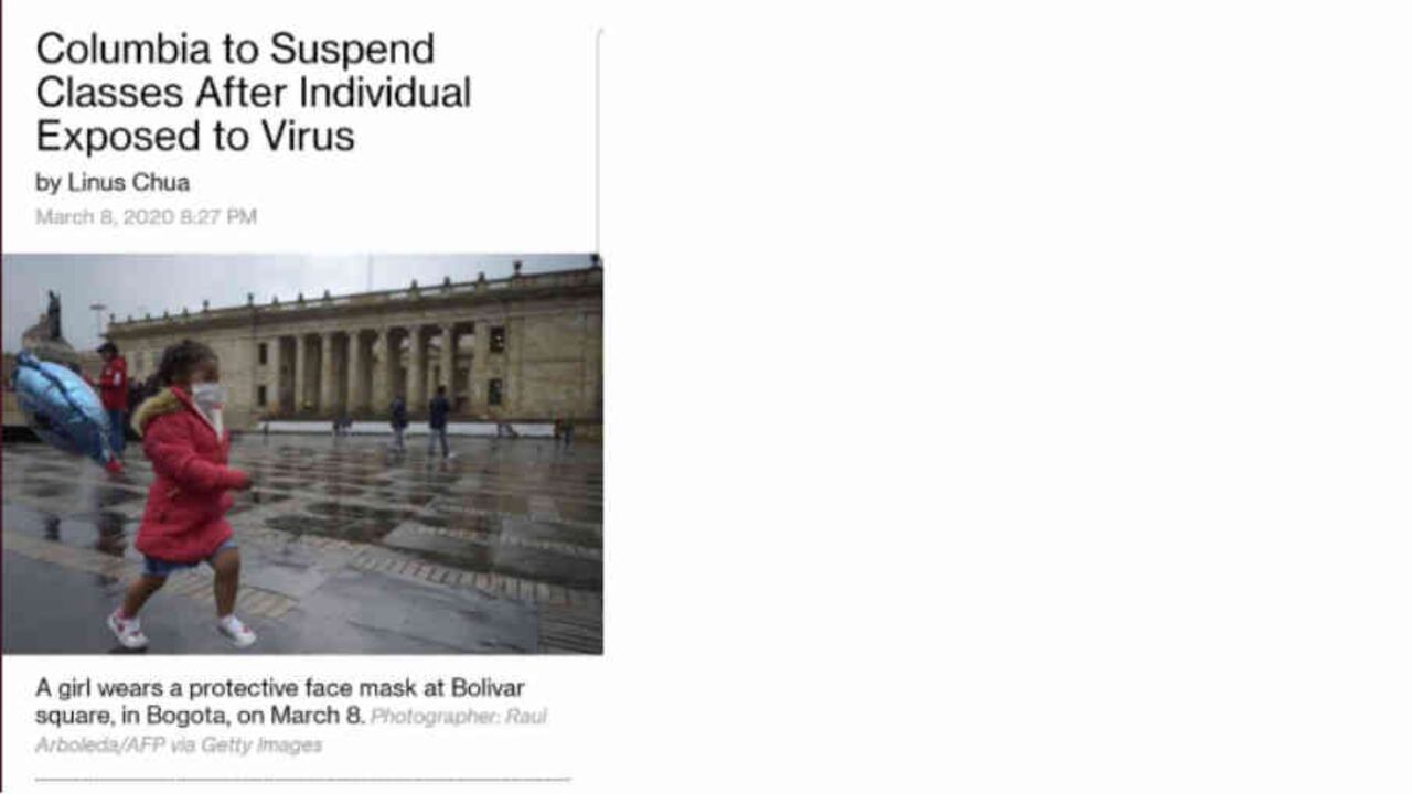Un despacho de la agencia Bloomberg, en el que anunciaba la suspensión de clases en la Universidad de Columbia debido a que uno de sus estudiantes estuvo expuesto al coronavirus, fue ilustrado erróneamente con una imagen de la plaza de Bolívar en Bogotá. El error probablemente se presentó en el momento de buscar en los bancos de imágenes fotos de Columbia y en el resultado se encuentran las de Colombia y que, además, cuadraban bien pues la imagen muestra a una niña corriendo y con un tapabocas en su cara. Esta equivocación refuerza la idea de la campaña que hace algunos años usaba la frase It's Colombia not Columbia, para diferenciar al país de la prestigiosa universidad. La alerta sobre la foto errónea fue hecha a través de Twitter por el ex Ministro de Hacienda Mauricio Cárdenas, pero en la página Web de Bloomberg ya la foto fue retirada.