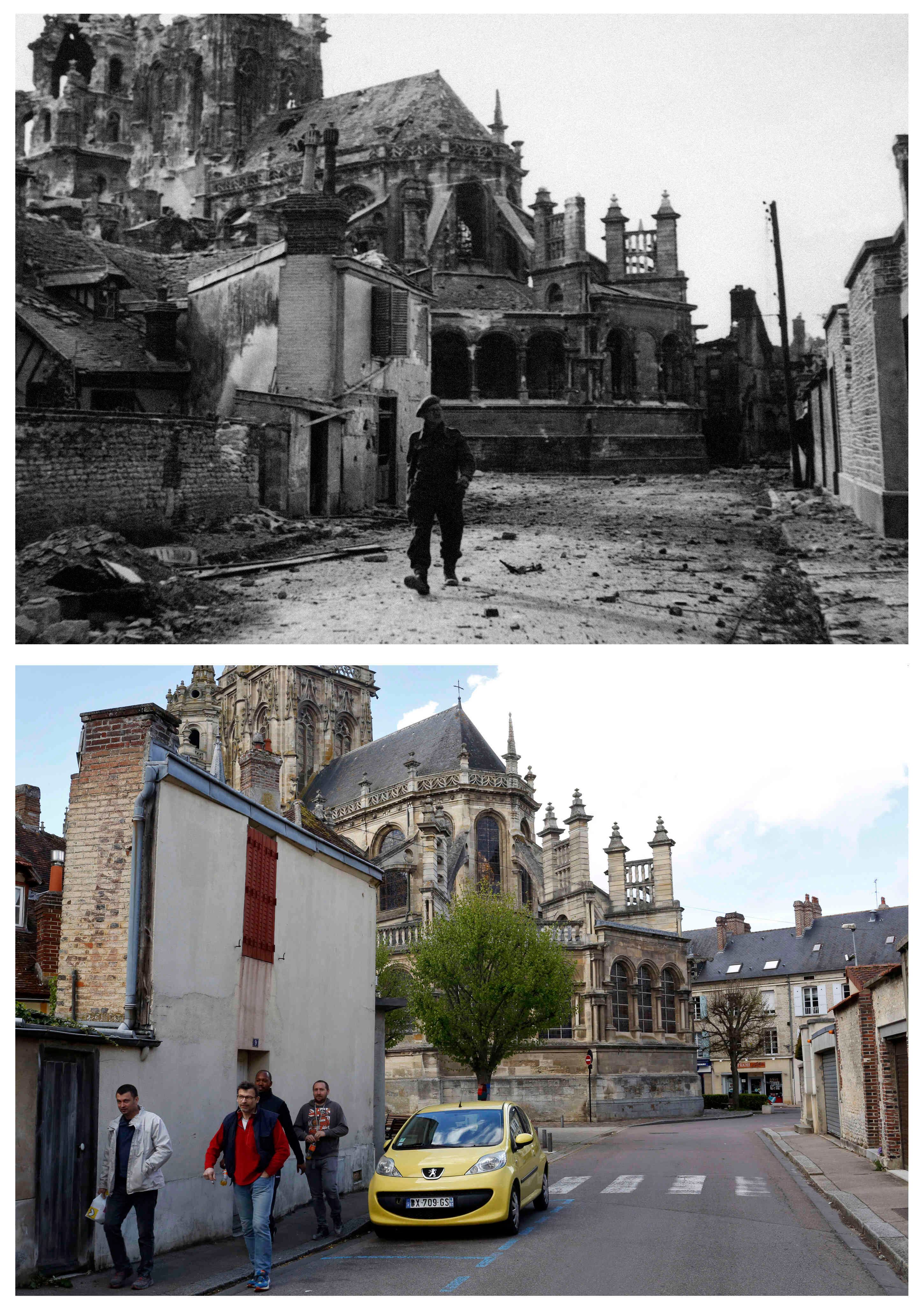 los soldados británicos desfilan por las ruinas de una iglesia en la ciudad de Pont-L'Eveque, dañada por la guerra, en la región de Normandía, Francia, en agosto de 1944. Abajo una vista de la misma ubicación el 10 de mayo de 2019. (Foto AP / Thibault Camus)
