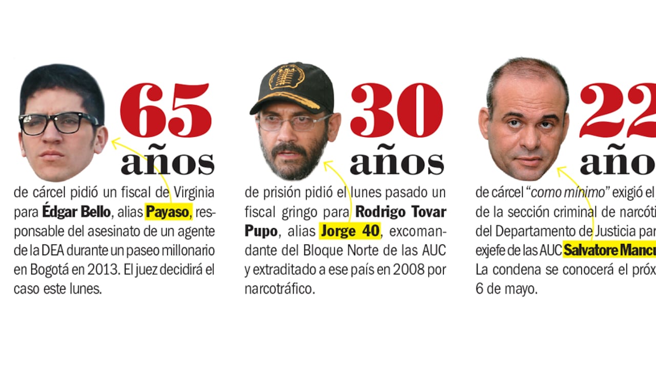 - 65 años de cárcel pidió un fiscal de Virginia para Édgar Bello, alias Payaso, responsable del asesinato de un agente de la DEA durante un paseo millonario en Bogotá en 2013. El juez decidirá el caso este lunes.