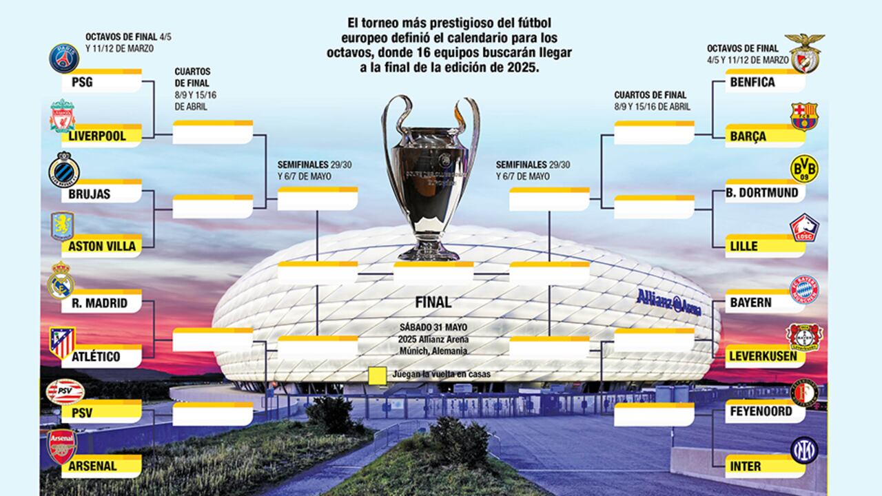 Además, Real Madrid y Barcelona quedaron en lugares distintos, por lo que se podrían ver en el partido definitivo. Igualmente, Liverpool y Atlético de Madrid no comparten zona con Bayern Múnich o Borussia Dortmund, por lo que solo se verían, cara a cara, en la final de Múnich 2025.