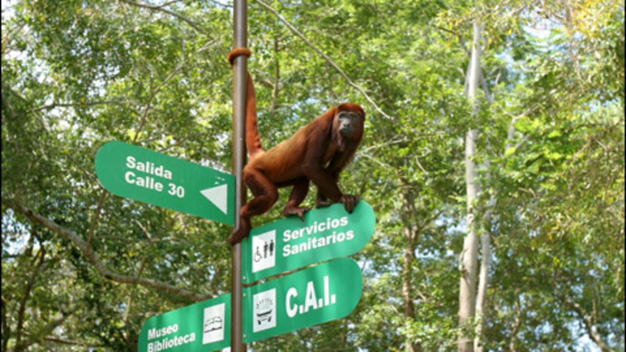 El malecón de Montería, sobre el río Sinú, fue reformado completamente. Ahora es un paseo adoquinado y lleno de árboles y plantas de la región. El cambio también trajo consigo nuevos habitantes a ese sector de la ciudad. Ahora conviven con los visitantes pájaros, iguanas y micos aulladores quienes están aprendiendo a acostumbrarse al gran trafico de personas que además de admirarlos, les brindan uno que otro bocado. Sobre todo estos últimos han descubierto en los cambios un nuevo mundo lleno de atracciones, como este mono, que parece divertirse mucho jugando encima del poste de señalización, como si se tratara de un árbol de mentiras. ?