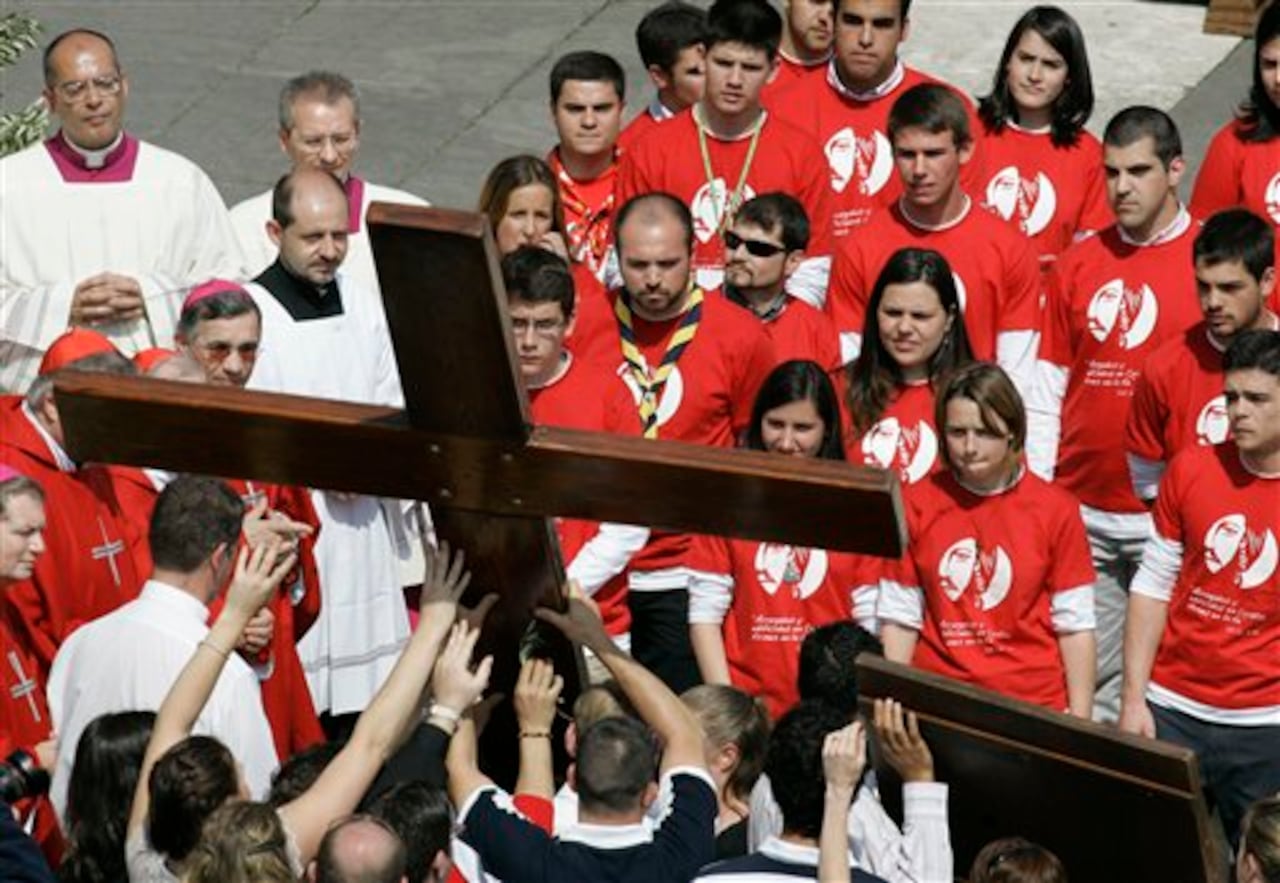 (Vaticano) Los jóvenes de Sydney, en primer plano, entregan la Cruz del Día Mundial Juvenil a jóvenes de Madrid en la plaza de San Peter. (AP Foto/Muelle de embarque Paolo Cito)