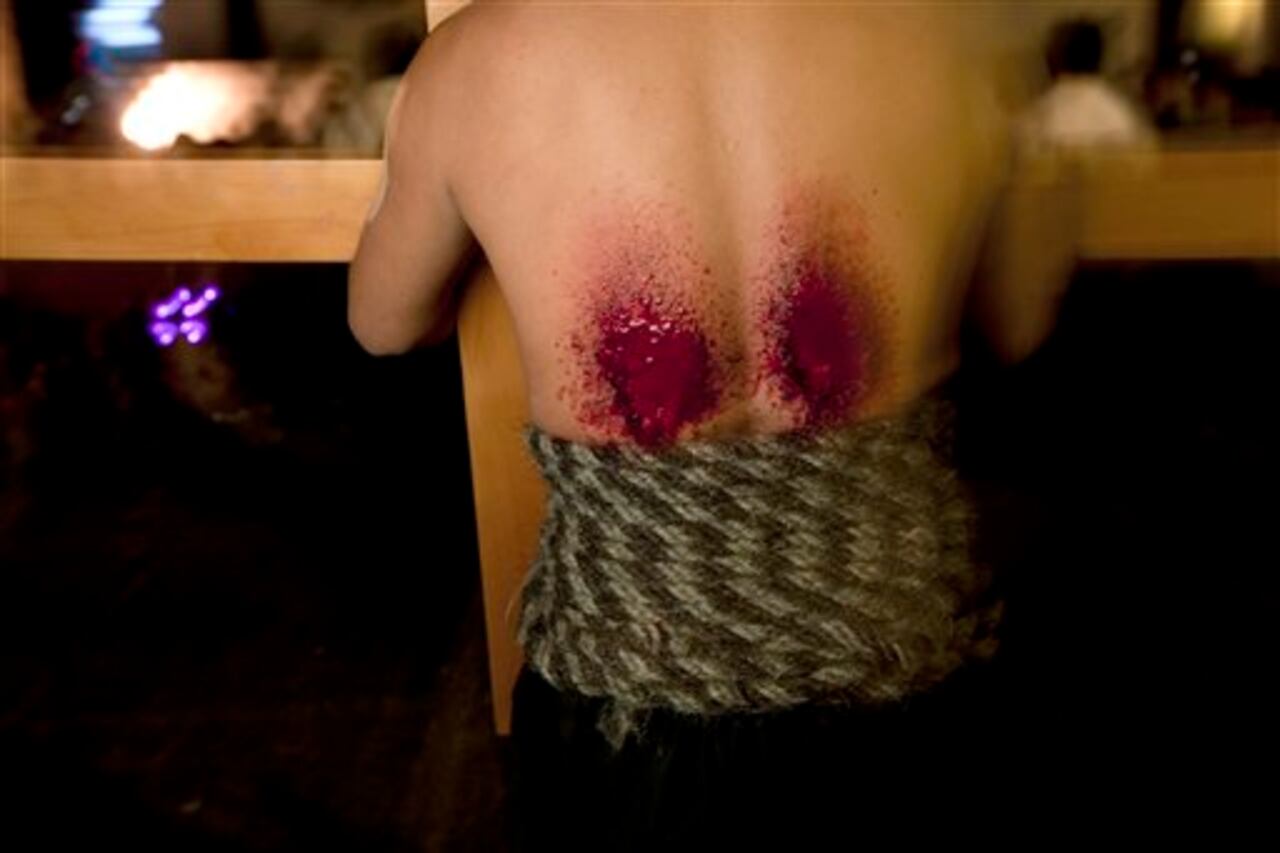(Taxco, México) Un hombre sangra en su espalda después de habérsela golpeado con una almohadilla con cactus durante la procesión de los penitentes. (AP Photo/Gregory Bull)