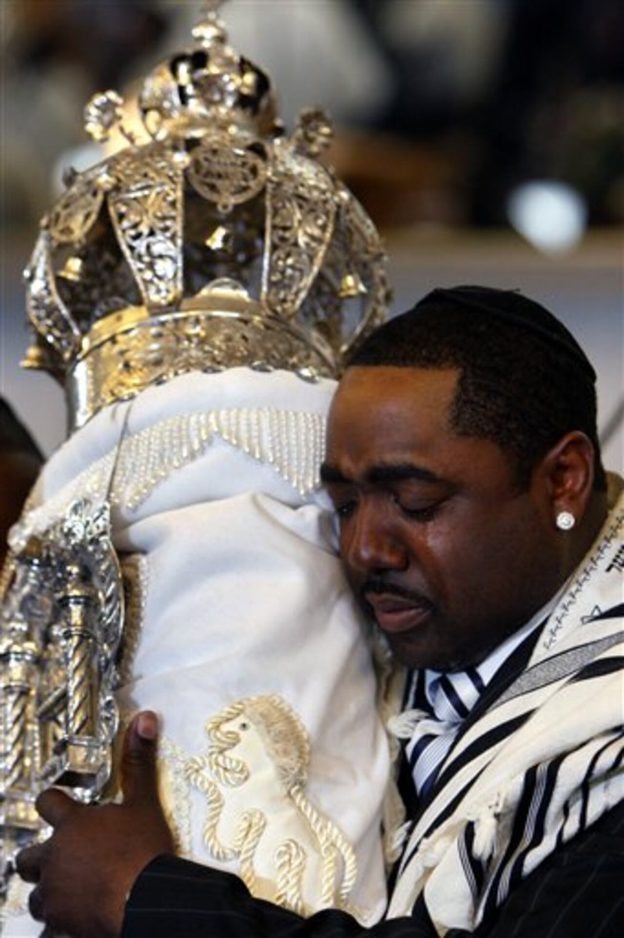 (Filadelfia, Estados Unidos) En el Templo Beth ' El, un miembro de la congregación judía llora al llevar la nueva Tora durante una ceremonia dedicada a este símbolo. (AP Foto / Joseph Kaczmarek)