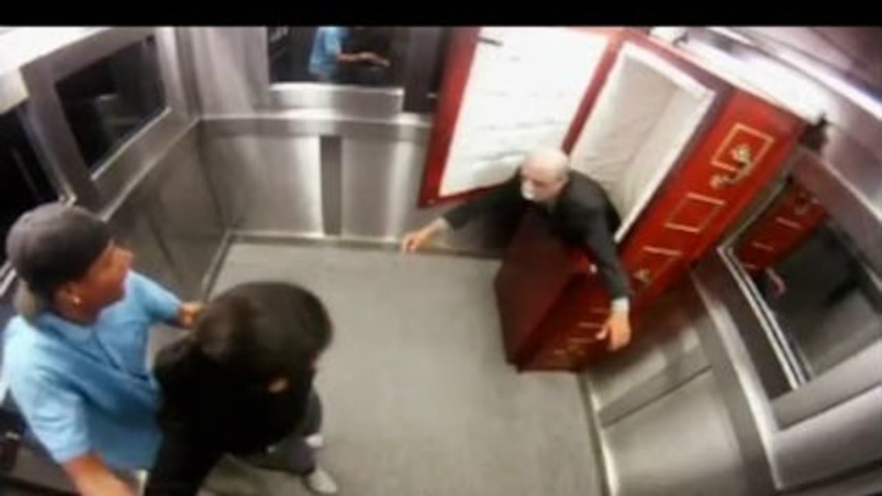 En otro nuevo capítulo, las víctimas de la ‘pegadinha’ suben a un ascensor, pero a última hora ingresan los operarios de una funeraria y las dejan en compañía de un ataúd.