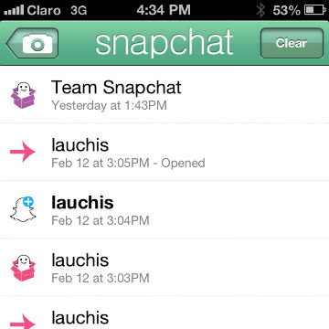 Para ver una foto que le envíen, es importante mantener el dedo sosteniendo el mensaje de la foto nueva hasta que se acabe el tiempo. En la imagen siguiente, el fantasma saliendo de la caja indica que ha recibido un nuevo mensaje. Las flechas muestran los mensajes que ha enviado.