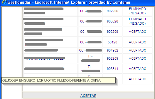 Aquí se observa sólo una parte de la lista de exámenes autorizados y negados por los validadores en una IPS en Medellín (se excluye la identidad de los pacientes). Abajo, un examen de glucosa en suero, disponible en cualquier centro de salud básico, fue negado por el validador de Sura, según una de las médicas consultadas por Semana.com porque “en una reunión nos dijeron que ante ‘cualquier mareo’ siempre pedimos glucosa, entonces por eso las auditan”.