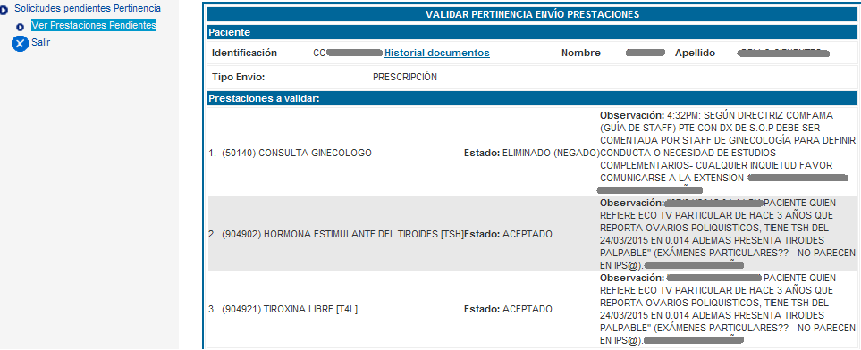 En este caso, el médico intenta remitir una paciente al pediatra por un presunto diagnóstico de disautonomía, ya que presentaba disminución de la presión arterial con el cambio de posición, justificado en la historia clínica. Pero dicha remisión fue negada y “se sugiere” comentar el caso en ‘staff’. También solicita exámenes de flujo vaginal que, como se evidencia en la imagen arriba, fueron autorizados y se encuentran disponibles en cualquier nivel de atención básico, según explica. Sin embargo, estos deben ser autorizados previamente dado que el protocolo establece que la paciente debe debió haber recibido tratamiento previo y que los síntomas no hayan mejorado para solicitar estos paraclínicos.