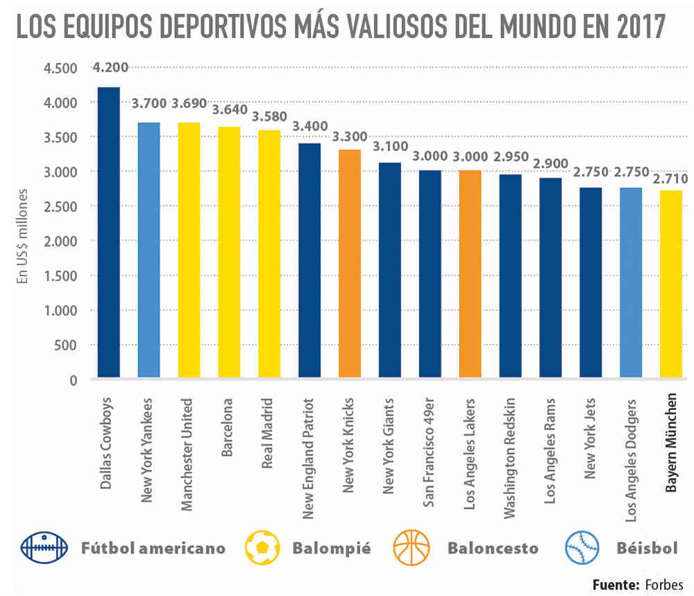 De acuerdo con el ranking anual que realiza la revista Forbes, en 2017 el equipo deportivo más valioso del mundo son los Dallas Cowboys, que se ratificó en ese lugar tras ocupar el primer puesto también en 2016. Ese año desplazó al Real Madrid, que desde 2013 era el líder del escalafón y que en 2017 cayó al quinto puesto, esta vez reemplazado por el equipo de béisbol New York Yankees, el Manchester United y el Barcelona FC.