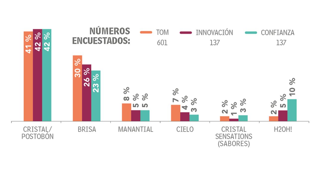Con 41 por ciento, Cristal/Postobón conserva el liderato del top of mind dentro de la categoría de agua embotellada, pero sigue una tendencia descendente, pues la cifra es de 4 puntos porcentuales menos que el año pasado. En Medellín tiene más del 49 por ciento y en Bogotá supera el 42 por ciento. Entre mujeres, el top of mind está por encima del 42 por ciento.