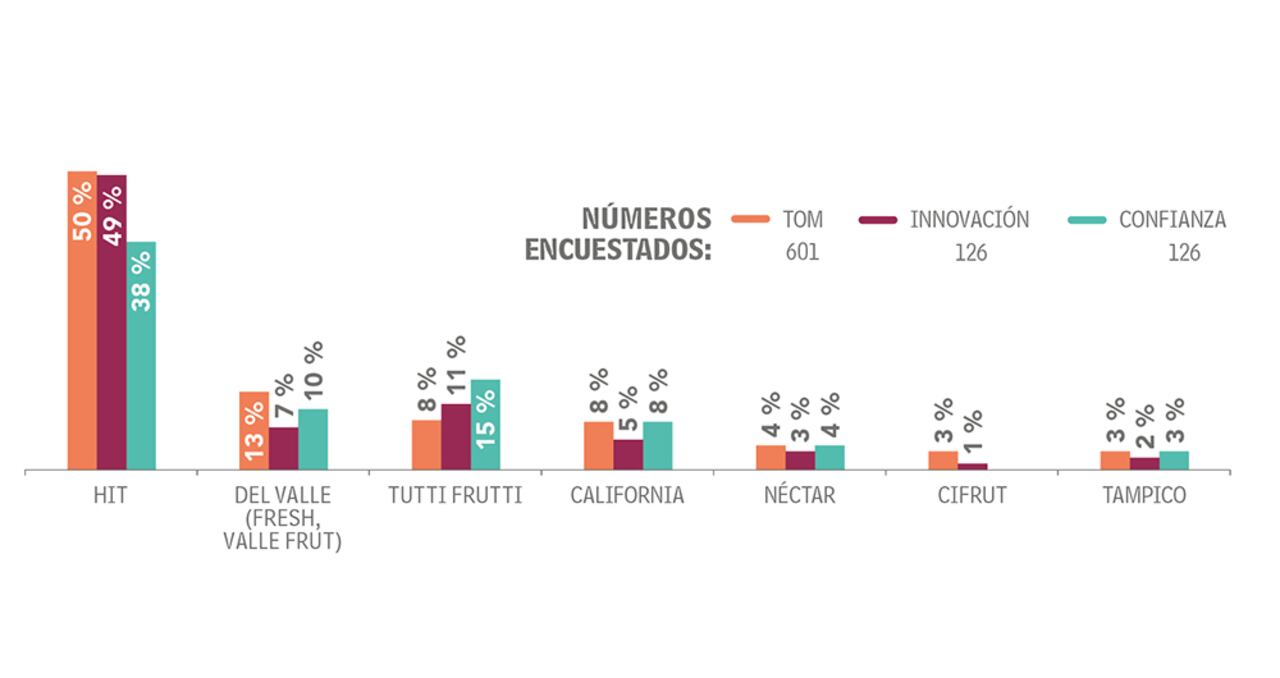 Sorprende Tutti Frutti, cuyos niveles de innovación y confianza son mayores a los del segundo lugar de top of mind, Del Valle. En innovación, mientras Del Valle alcanzó 7 por ciento, Tutti Frutti llegó a 11 por ciento; y en confianza, Tutti Frutti registró 15 por ciento frente a 10 por ciento de Del Valle.