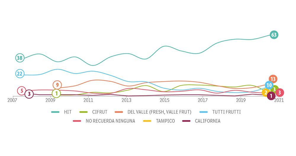 Del Valle sigue creciendo, sube 4 puntos y llega al 13 por ciento, mientras que Tutti Frutti tiene un incremento de 5 puntos y alcanza el 10 por ciento de recordación. Cifrut tiene la mayor caída, al perder 8 puntos y quedar con 3 por ciento.