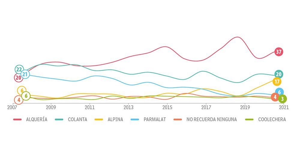 Alquería retoma la senda de crecimiento y aumenta en 4 puntos porcentuales su top of mind, llegando al 37 por ciento. Mientras tanto, Colanta pierde un punto porcentual y se queda en 20 por ciento.