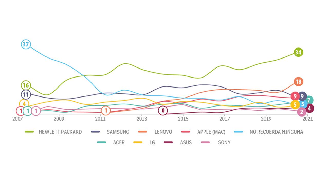 Hewlett Packard (HP) conserva su tendencia creciente: aumenta este año frente a 2020, 4 puntos porcentuales y alcanza 34 por ciento en el Top of Mind, su cifra más alta a lo largo de la historia del estudio.