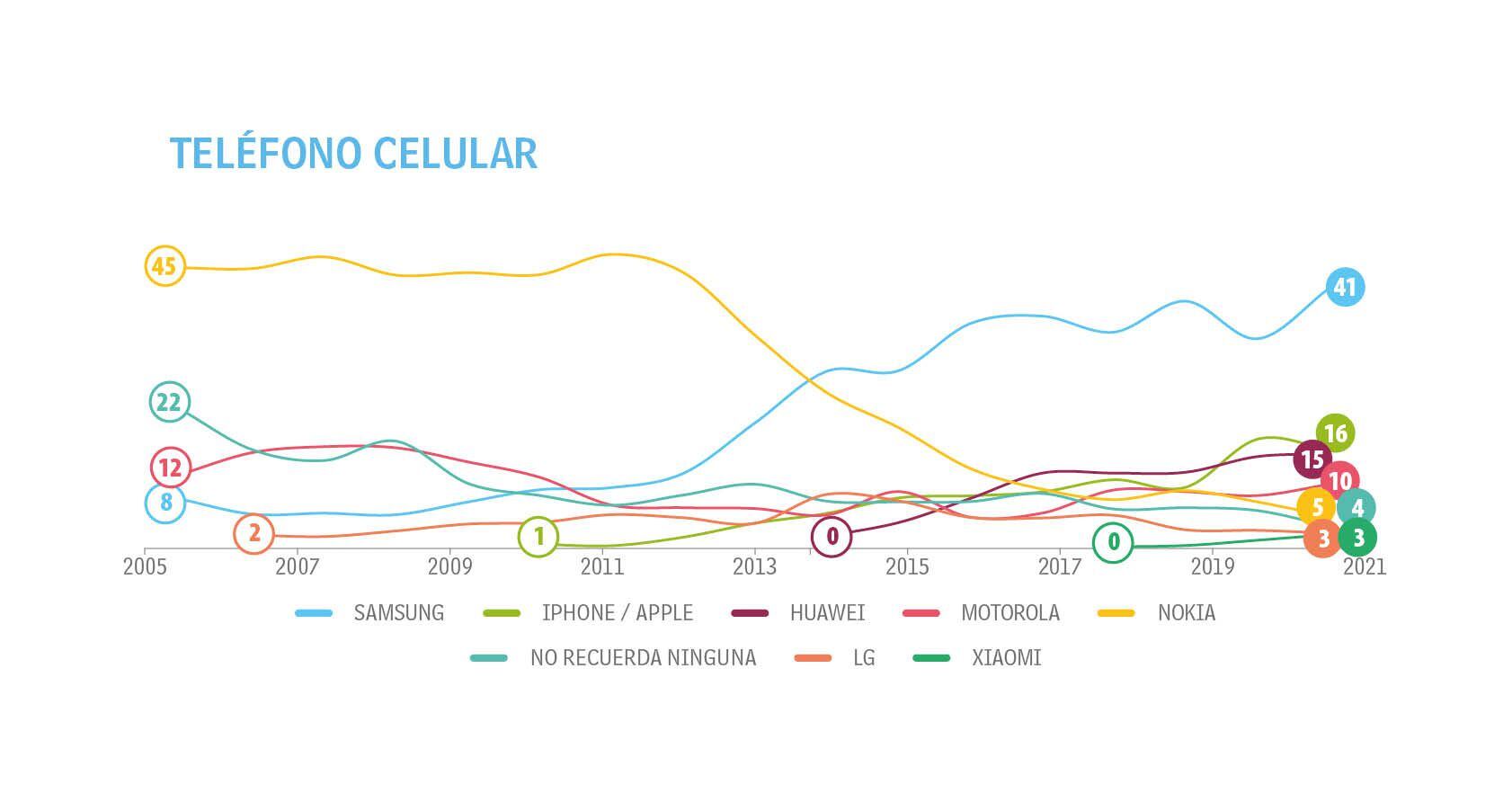 Samsung es la marca líder en el Top of Mind en la categoría de teléfonos celulares. Llega al 41 por ciento tras un incremento de 8 puntos porcentuales este año. Con ese porcentaje alcanza su registro más alto en la historia de la medición.