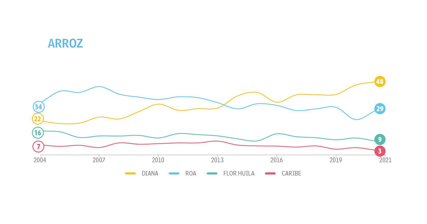 Diana ratifica su liderazgo en el top of mind de la categoría con 48 por ciento, 2 puntos porcentuales más que el año pasado. Con esta cifra no solo mantiene su tendencia creciente, sino que alcanza su mayor recordación a lo largo de todo el estudio. Le sigue Roa, que se recupera tras la caída del año pasado y aumenta 6 puntos porcentuales, hasta llegar a 29 por ciento. Florhuila cede terreno y baja a un dígito, perdiendo 2 puntos porcentuales. Diana obtiene en Barranquilla un top of mind de 63 por ciento y en Bogotá llega a 51 por ciento. Por género, en las mujeres alcanza 52 por ciento frente a cerca de 44 por ciento en los hombres, y, por estratos, en el 2 obtiene 55 por ciento. En el grupo de edad de 18 a 24 años, su top of mind supera el 56 por ciento. Roa tiene en Cali su mejor registro, 40 por ciento, como la marca de arroz más recordada en esa ciudad. Y en hombres llega a 35 por ciento. También en el segmento de 18 a 24 años logra su mayor indicador por grupos de edades con 34 por ciento. Diana alcanza los mayores niveles de innovación y confianza en la categoría con 44 y 43 por ciento, respectivamente, en tanto que Roa llega a 34 y 35 por ciento.