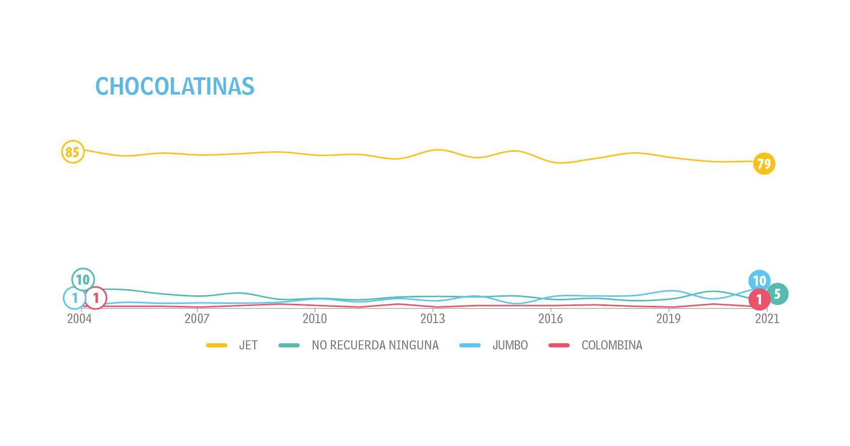 Con 79 por ciento, Jet continúa como marca líder absoluta en el top of mind de la categoría de chocolatinas y mantiene el porcentaje del año anterior. Jumbo se recupera de la caída de 2020 y gana 5 puntos porcentuales; alcanza el 10 por ciento y con ello registra el indicador más alto durante la medición. En Bogotá, Jet tiene el 82 por ciento de recordación, y en Medellín, el 80 por ciento; a la vez que en los estratos de mayores ingresos llega al 80 por ciento. Donde se ve movimiento es en los grupos de edad: mientras en el segmento de 35 a 49 años el top of mind alcanza el 86 por ciento y en los mayores de 50 años el 80 por ciento, en los adultos más jóvenes –de 18 a 24 años– el registro fue del 66 por ciento. Jumbo tiene su mejor registro en Cali con más del 14 por ciento, y en los estratos 2 y 3 supera el 11 por ciento; en los adultos más jóvenes llega a cerca del 27 por ciento. En materia de innovación y confianza, Jet ratifica el liderazgo que tiene en el top of mind. En innovación es la abanderada de la categoría para los encuestados, con el 72 por ciento, y los niveles de confianza llegaron al 74 por ciento.