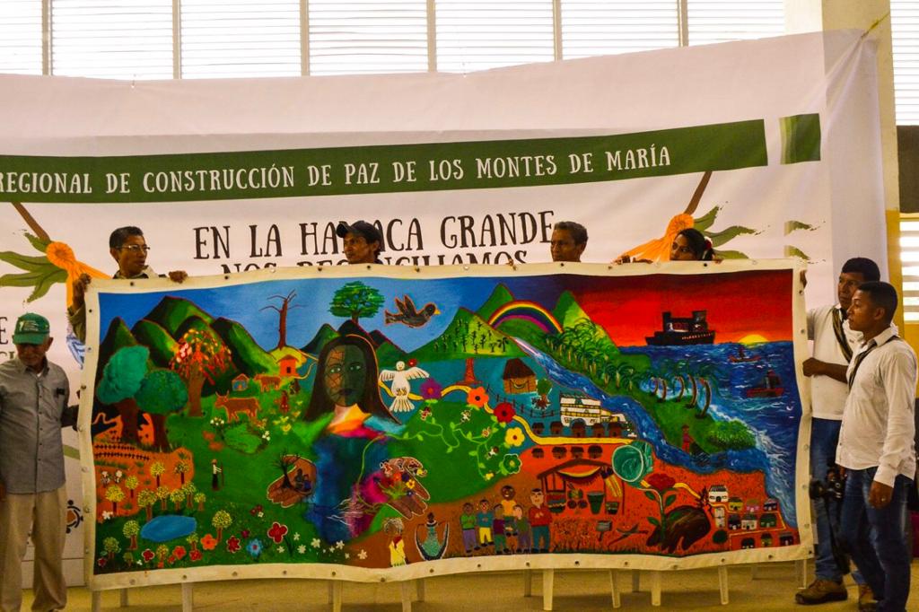 La esperanza se vistió de arte el segundo día del encuentro. Habitantes de diferentes municipios de Montes de María y algunos excombatientes de las Farc, con el acompañamiento de la artista salvadoreña América Vaquerano, plasmaron en un lienzo la historia del conflicto armado en el territorio montemariano, desde las masacres hasta la luz de un nuevo amanecer.