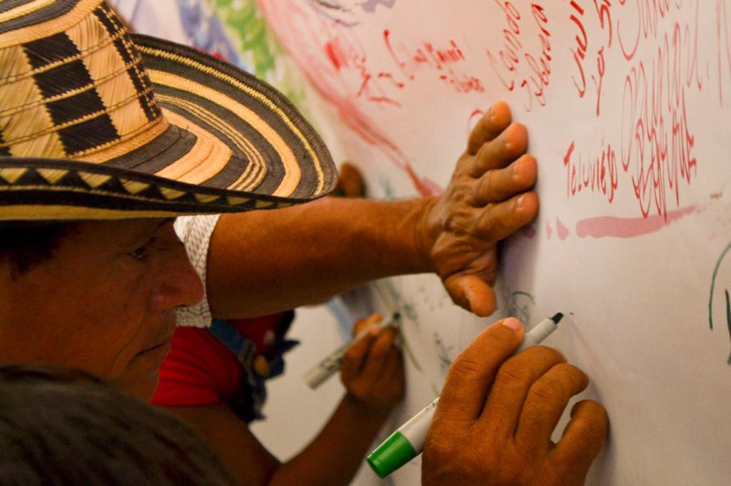 Los asistentes al Festival dejaron sus nombres en un lienzo que representa "la hamaca grande" como muestra del compromiso con la reconstrucción de la verdad. ©MARLON MÁRQUEZ.